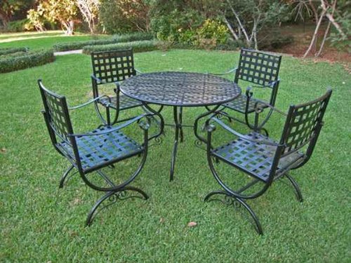 Contempo Iron Round Table and 4 Chairs - Wrought Iron design - Black finish - Great for porch or patio - Set includes round table and 4 chairs - Table has a hole to accommodate an umbrella - Sleek Contempo design - (Colors on your screen may not reflect actual colors due to differences in monitors and computer settings) - Electrophoresis treatment for durability - Dimensions for table are approx 40 in diameter and 29 inches high. Chairs are approx 27 wide x 39 high at the back x 22 inches deep. Seat height is 18 inches from the floor - Hardware and instructions included - some assembly required - Item 3480-EP - Sale is for Dining Set only, excludes cushions - We do accept returns, but please read our RETURNS POLICY before you buy. If you do not like the item you purchased, the cost of returning your purchase back to us and the restocking fee (what we pay UPS to ship to you) is expensive - UPS Ground Shipping is FREE NATIONWIDE